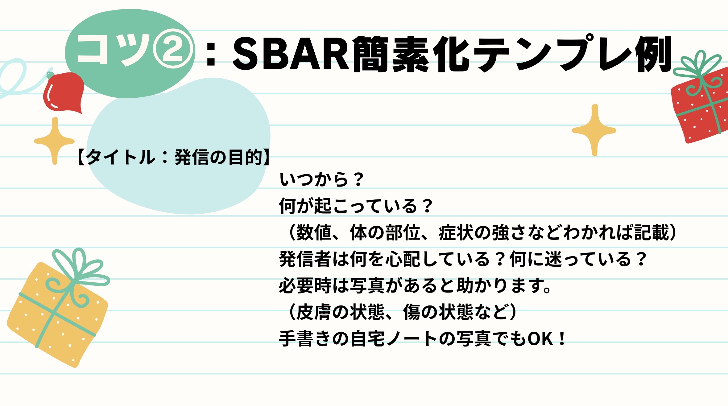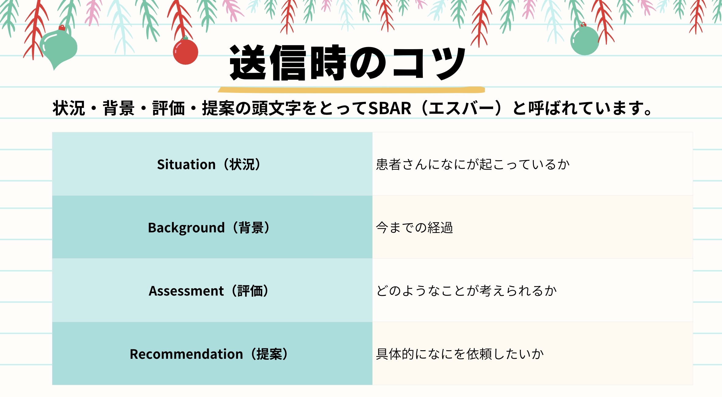送信時のコツとしては、SBAR を意識していただくと、内容が整理されてとても伝わりやすくなります