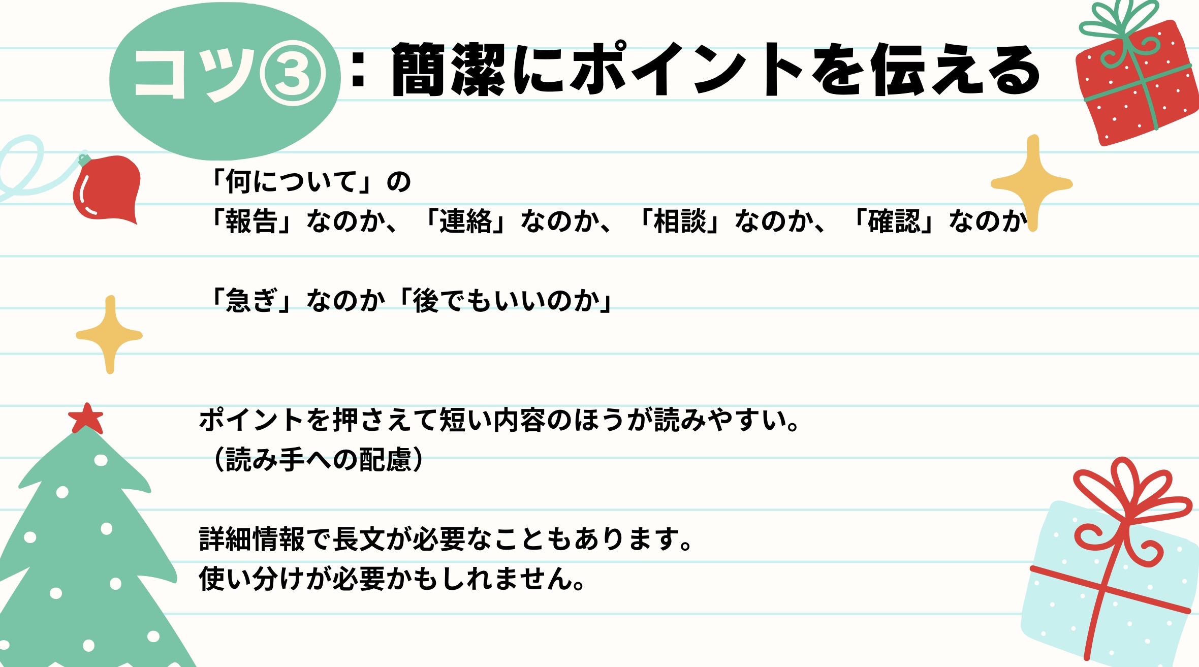 長文が必要な場合もありますが、まずはポイントを押さえて簡潔にまとめていただくことが、読み手への配慮にもつながります。