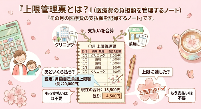 上限管理票は、病院や薬局での支払いを合算して、「今月の支払いの合計が上限に達しているか」を正しく把握するために使われます。